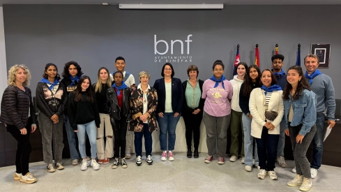 Cinco estudiantes franceses de 1º de Bachillerato, con dos profesores, seis binefarenses de 4º de la ESO y 1º de Bachillerato han conocido el Salón de Plenos, en que se expone la historia consistorial desde el siglo XIX y el despacho de alcaldía. Allí la alcaldesa les ha hablado sobre la historia y el presente del municipio.