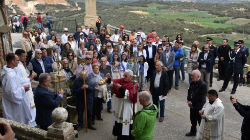 A la llegada de la romería a la explanada del Monasterio, ha tenido lugar el tradicional saludo de las cruces, entre las de Barbastro, Berbegal y el Monasterio de El Pueyo, antes de la celebración de la eucaristía en la iglesia de El Pueyo. Al finalizar, los asistentes han podido pasar por el camarín de la Virgen y, después, han recibido un panecillo bendecido.