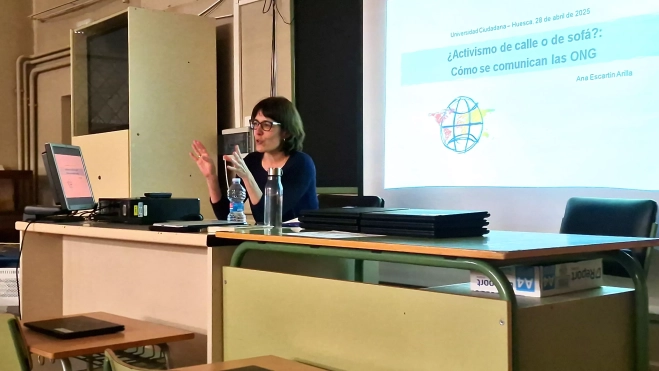 Ana Escartín impartió recientemente una conferencia en el IES Ramón y Cajal de Huesca, organizada por la Universidad Ciudadana, con el fin de acercar a un público amplio técnicas que, mas allá de las prácticas de estas organizaciones, ayuden a ejercer una lectura crítica.