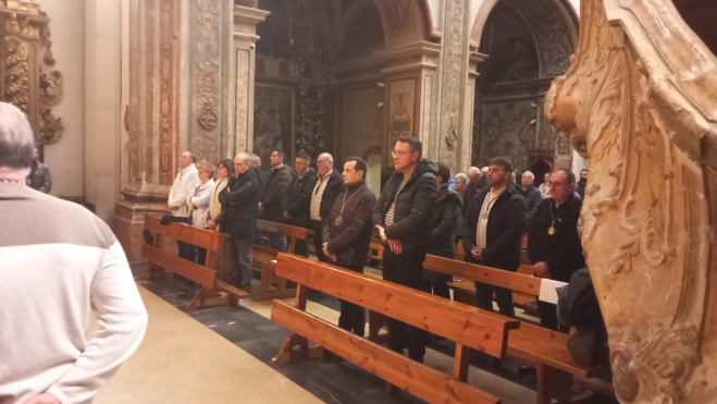 El objetivo de las Semblanzas de la Semana Santa es conocer las culturas, tradiciones y costumbres de otras ciudades y ya acumulan relaciones que han resultado fructíferas con lugares como León, La Rioja, Cuenca o Segovia. En esta ocasión, las hermosas celebraciones turolenses protagonizan el ciclo, con correspondencia en 2026 de Huesca que será agasajada en Teruel. Tras la celebración en la iglesia barroca, los 14 turolenses y una delegación oscense han disfrutado de una cena.