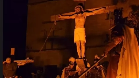 La medianoche marcó el inicio del vía crucis viviente, con la salida puntual desde el ayuntamiento. Un silencio estremecedor envolvía la escena mientras Jesús de Nazaret, portando la cruz, avanzaba hacia el calvario escoltado por una cuadriga de romanos, las tres Marías y Juan. El sonido del arrastrar de la cruz sobre el suelo, junto a la tenue luz de las antorchas portadas por vecinos ataviados con vestimenta de época, crearon una atmósfera cargada de solemnidad y recogimiento.