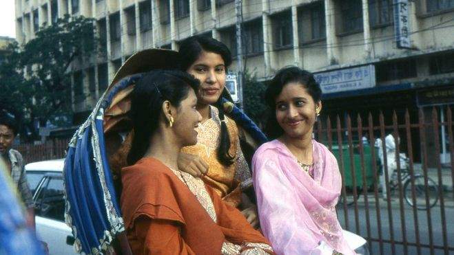 Tuve que ponerme serio para obligarle a salir de allí. Aun así, al salir a la calle, aún siguió insistiendo. A muchas chicas, imagino que quienes tenían más recursos, iban a buscarlas en rickshaw, el taxi en Bangladesh, de manera que corriendo por la calle situaba su rickshaw al lado del de ellas, ocupados por dos o tres chicas, e iba habándoles a la vez que corría tirando del rickshaw a la par de ellas. Supongo que les hablaba de mí, pues veía que ellas miraban de reojo, se ruborizaban y sonreían.