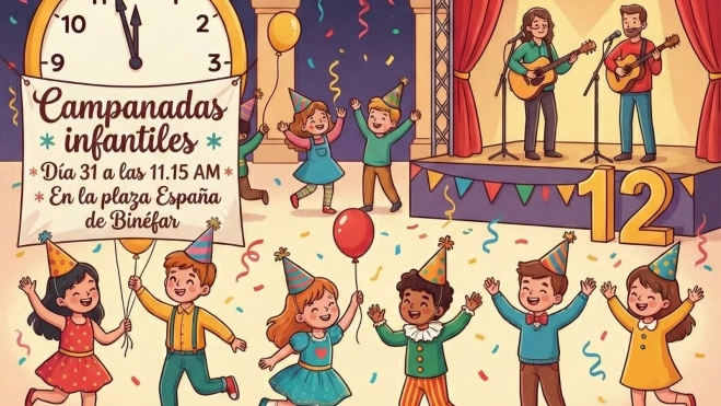 Los niños de Binéfar y comarca podrán disfrutar de la Nochevieja el mediodía del día 31 con unas Campanadas infantiles, una de las novedades del programa de Navidad de este año. La Concejalía de Actos Populares y Festejos ha organizado una fiesta con música en directo, uvas, cotillón, música con el Dúo Bellera y el anuncio de las campanadas por unos presentadores muy conocidos por los niños.
