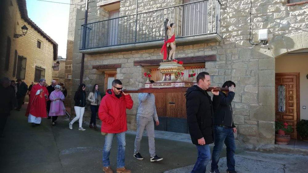 Biscarrués celebra estos días las fiestas de San Sebastián, que este viernes ha incluido la procesión y una cena y este sábado se iniciará la reforestación con bellotas de la peña de los Moros.