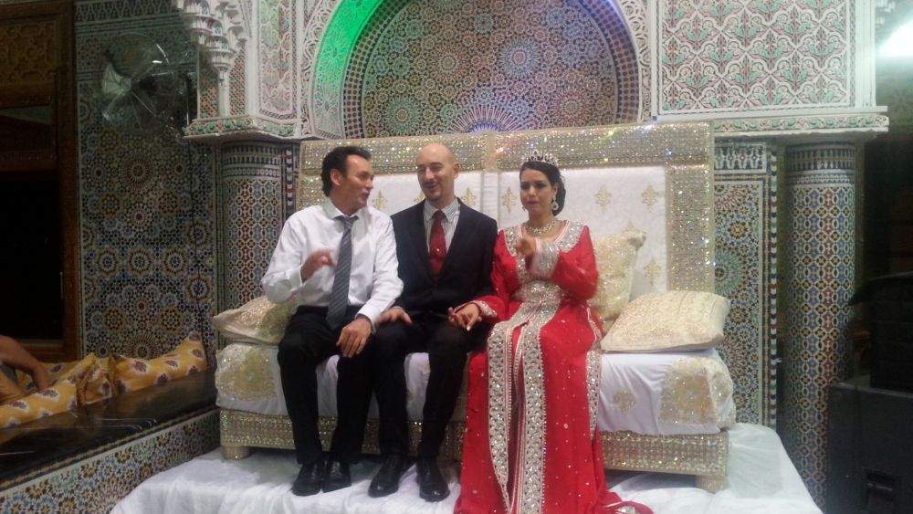 La fiesta se celebraba en la tarde. Por la mañana los novios, aunque ya casados  en España, tuvieron que realizar la fase jurídica marroquí, donde se lleva a cabo la firma del contrato por el cual la custodia de la mujer pasa al marido.  Tras concluir las formalidades, donde también se requerían dos testigos, sólo quedaba la parte social  con la fiesta, programada en la tarde, creo que sobre las cinco, culminando en la noche con el traslado de la esposa a la casa del marido, donde tiene lugar la consumación del matrimonio. Este paso ya se lo habían saltado hacía más de un año.