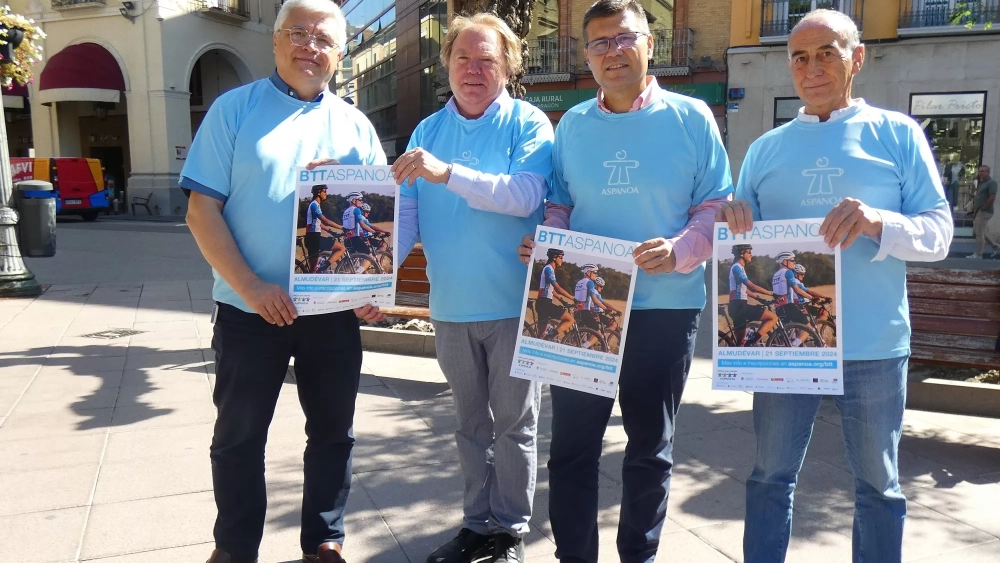 Esta actividad solidaria ha sido presentada este miércoles en la Oficina Principal de Caja Rural de Aragón en Huesca, donde han estado presentes el gerente de Aspanoa, Juan Carlos Acín, el director técnico de la prueba, Antonio Justes, el alcalde de Almudévar, José Luis Abad, y el director de Zona Huesca de Caja Rural de Aragón, Jesús Uriol.