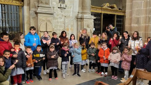La bendición ha sido oficiada en la Catedral por su párroco "in solidum", Antonio Mozás, en una simpática ceremonia, 'custodiado' por alumnos de 5 a 12 años de Escolapios y el Grupo Tradiciones con la emblemática Elita Davias al frente.