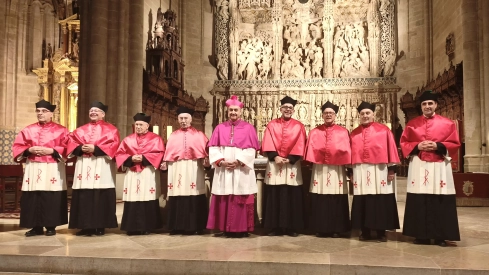 Frente a la sede del obispo se ha colocado una mesa con el crucifijo y el libro de los Evangelios abierto con un reclinatorio delante por el que pasaban, uno a uno, los nuevos Canónigos. El deán-presidente del Cabildo ha dado lectura a los nombramientos y los que han sido designados hacen profesión de fe.