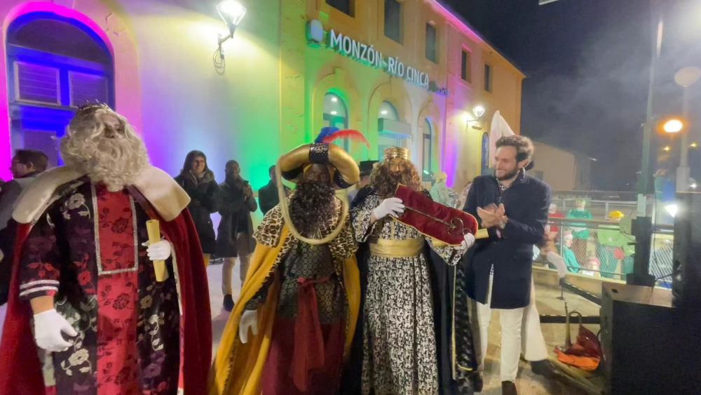 Puntuales han llegado a la estación de tren de Monzón este domingo Sus Majestades los Reyes Magos de Oriente, donde les esperaban cientos de familias y el alcalde de la ciudad, Isaac Claver, que ha hecho entrega a Melchor, Gaspar y Baltasar de la llave de la ciudad para que puedan dejar sus regalos esta noche mágica.