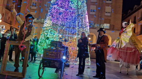 A las 18.00 horas, el pasacalles organizado por Civi-Civiac Magic Móvil ha reunido a numerosas familias en la plaza en una novedosa apertura de este tradicional mercado navideño, que ha contado con magia, diversión y un animado recorrido por todos los puestos abiertos.