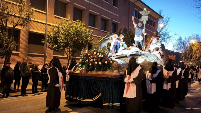 Las túnicas marrones sobre las que sobresalen los escapularios blancos con la Cruz de Santiago en rojo han recibido la bendición y la oración del párroco de Santiago, Luis Gurrucharri, por los cofrades difuntos y por el desarrollo del desfile procesional. Y, a las ocho de la tarde, arrancan, por delante los grupos de tambores de El Descendimiento y del Cristo de la Esperanza, el propio de la Cofradía titular por detrás del paso.