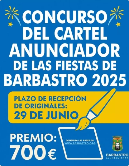 El Ayuntamiento de Barbastro concluye el 29 de junio el plazo de recepción de originales del concurso convocado para elegir el cartel anunciador de las Fiestas en Honor de la Natividad de Nuestra Señora, que tendrán lugar del 4 al 8 de septiembre de este año.
