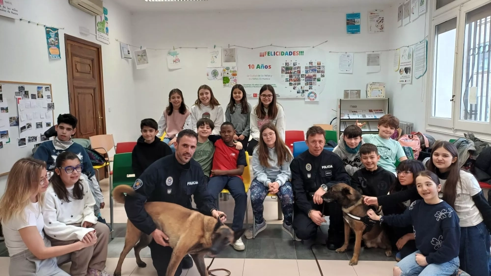 Los agentes y sus compañeros a cuatro patas han realizado una demostración práctica en la que los niños han podido comprobar cómo los perros localizan estupefacientes y otras sustancias, además de interactuar con los animales y plantear preguntas sobre su preparación y su labor diaria.