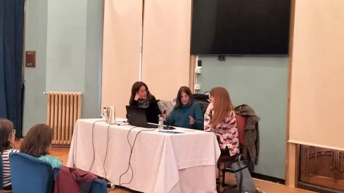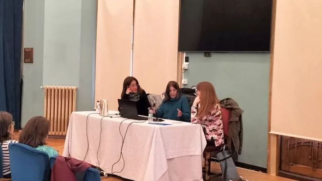 Acompañada por Irene Abad y Sescún Marías, y en un acto organizado por el Colectivo de Mujeres Feministas, la autora de Las desterradas hijas de Eva explicó este lunes, para un público que abarrotaba el Salón Azul del Casino de Huesca, en qué consistió esta institución y cuál fue su terrible experiencia.