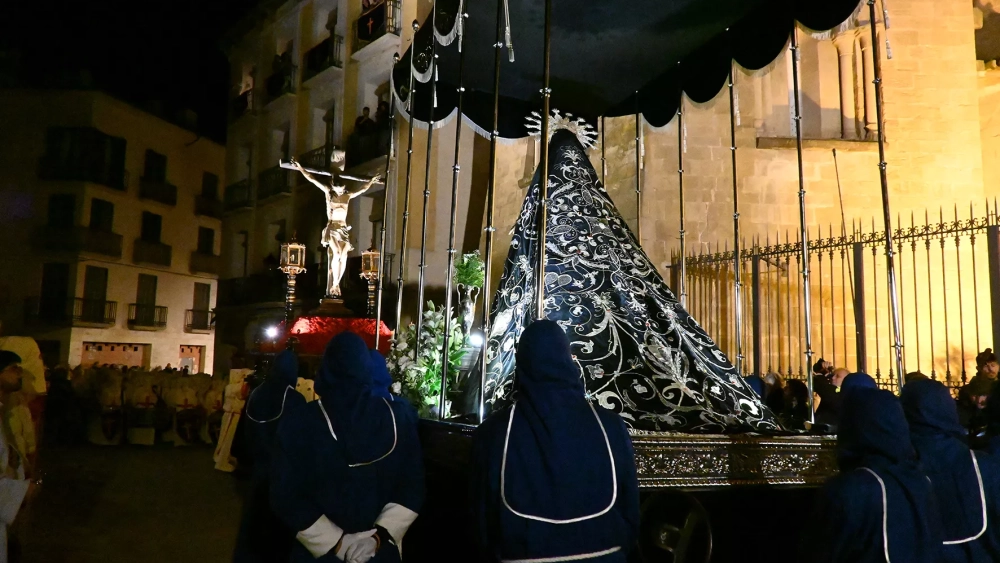La Virgen Dolorosa ha partido media hora más tarde, al son de clarinetes y timbal, 50 minutos transcurridos de la medianoche, desde la Catedral por Las Cortes y San Salvador hasta la Plaza de San Pedro. Las cofrades, con su túnica y tercerol azul con cruz, bocamangas y cíngulo blanco, han discurrido con fluidez solemne bajo las instrucciones de la priora, Bettina Bernhard. Casi una centuria precede desde la constitución de la cofradía, delicadeza en el transcurrir del paso de Vicente Vallés de 1947 y con los bellos manto y palio confeccionados por la inolvidable María Antonia Sanagustín Ciria. La oración del Papa Francisco sirve de inspiración: "Miremos a la Virgen María y a San Juan, y permanezcamos junto a las muchas cruces en las que Jesús está todavía crucificado. Este es el camino en el que el Redentor nos llama a seguirlo. ¡No hay otro, es este!"