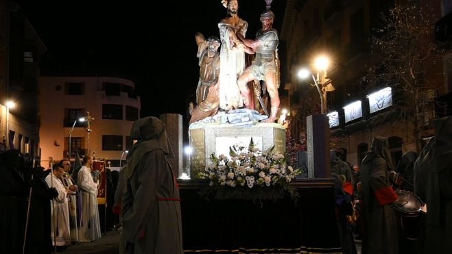 En lo profundo de la noche, muchos penitentes y mucho público. Tras la salida del templo, la ruta avanza por Coso Bajo, la calle Sancho Ramírez, Travesía Ballesteros, José María Lacasa, calle Lanuza y otra vez el Coso Bajo, Pasada la 1:30 de la madrugada, el paso descansa, una oración y un 'hasta el Martes Santo'.