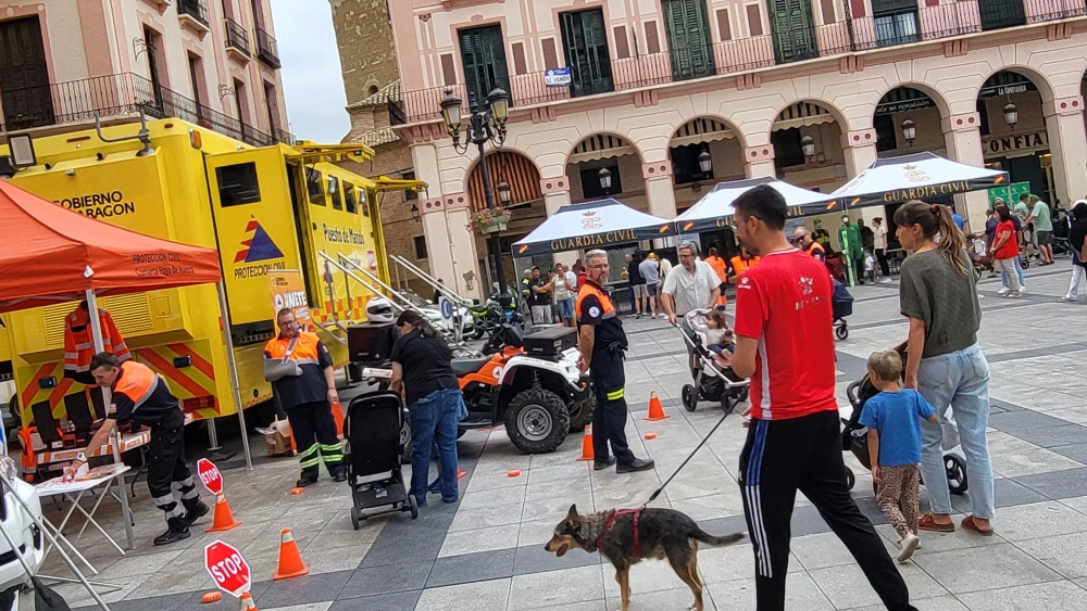 El evento tiene lugar en la Plaza Luis López Allué de Huesca, donde la ciudadanía puede conocer de cerca el trabajo de organismos como Policía Nacional, Policía Local, UME, GRUSAN II/1, GREIM, 112 Aragón, SEPRONA y Protección Civil, entre otros.
