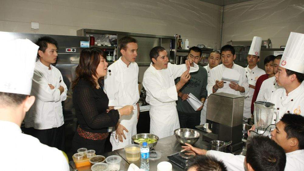 Repasando su recetario con él mismo me comentó sin ningún rubor: 'Juan, sé que soy el mejor cocinero de China, pero no sé hacer postres como los vuestros (españoles). Y tampoco estoy familiarizado con la cocina de vanguardia, la de Ferrán Adriá'. Llamé a Carmelo Bosque desde Pekín y se puso en marcha una relación que duró varios años y que culminó, por un lado con varios viajes por parte del mismo Carmelo y de Raúl Ruiz -cocinero que entonces estaba en su equipo- ofreciendo diferentes clases y cursos ( momento que recoge la fotografía), y por otro con varios envíos de productos que Da Dong demandó: aparatos, gelificantes, sistemas de vapor y de vacío, para hacer esterificaciones, espumas y otros inventos e innovaciones coquinarias de la época.