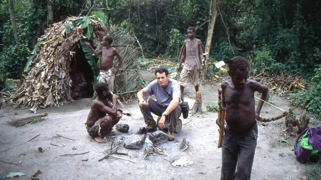 Al poco de abandonar el campamento de los pigmeos entramos en la espesura de la selva. La simple tarea de avanzar resultaba complicada, no existían sendas o una vía despejada donde transcurriera el recorrido. Teníamos que abrirnos paso entre árboles, plantas y ramas que impedían la visión más allá de nuestras narices en medio de un espeso follaje donde ni siquiera la luz podía penetrar. Los pigmeos andaban desnudos, moviéndose con una agilidad que me asombraba. Yo iba vestido con ropa y calzado con botas, tropezando con ramas y raíces, llenándome de rasguños brazos y piernas, cubriéndome de fango hasta más arriba de los tobillos.