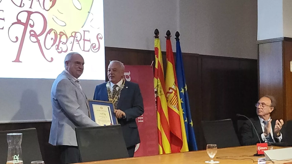 ¡Celebremos juntos el poder del arte! El presidente del Rotary Club de Huesca, José Luis González, ha concluido con esta expresión el acto de entrega de la Distinción Rotaria 2024-2025 a Luis Manuel Casáus, director del Teatro de Robres, en el salón de actos de la Cámara de Comercio en el que ha habido representación de las distintas instituciones (incluida la robresina con su alcalde, Álvaro Domec) y de las Fuerzas y Cuerpos de Seguridad del Estado.