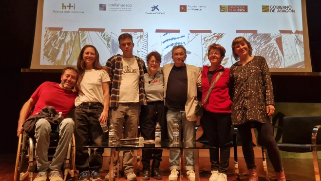 Natalia D'Anunzio y Elies Soler, artistas de la obra Rodem?, Ana Delia Gracia, vinculada al Centro Ocupacional de Comarca del Sobrarbe, de Valentia, Charlotte Bouguet, profesora de Teatro Social, Eduardo Cajal, artista y director del Taller de Arte de Valentia, y Lorenzo Barreu, componente del grupo de música Empoderaos, de Arcadia, han protagonizado un debate, moderado por la directora del festival, Elena Gómez, en el que se ha dejado entrever ese poder seductor de la diferencia.
