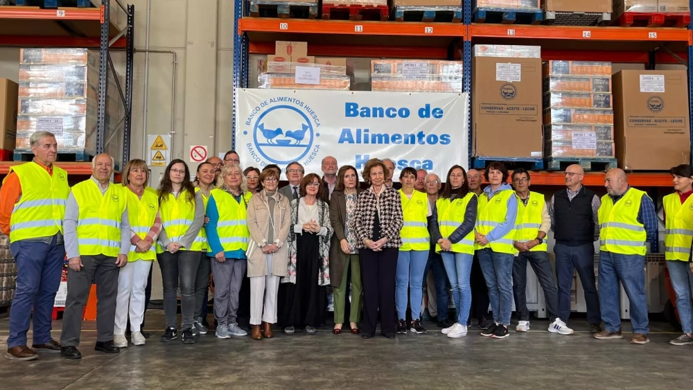 La reina emérita Doña Sofía se ha interesado por el trabajo que realiza el Banco de Alimentos de Huesca, ha valorado su labor y le ha prometido una cámara congeladora, ya que actualmente no tiene ninguna, para que pueda disponer también de producto fresco.