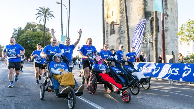 Dos corredores solidarios de Huesca, Carlos Javier García López y José Fabana participaron este domingo en el Zurich Maratón de Sevilla empujando las sillas de ocho jóvenes con ataxia telangiectasia. Corrieron los 42 km formando parte del Equipo Zurich Aefat, que consiguió completar su maratón número 31 por la investigación de la ataxia telangiectasia, una enfermedad rara, genética y neurodegenerativa que aún no tiene cura, y que afecta solo unos 40 niños y jóvenes en España.