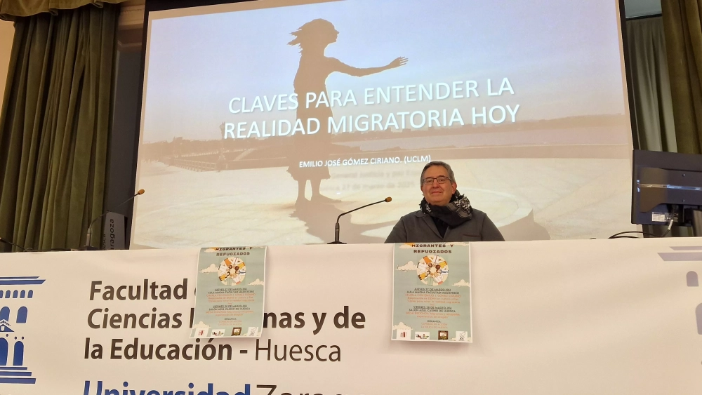 El Aula Magna de la Facultad de Ciencias Humanas y de la Educación acogió este jueves, 27 de marzo, la charla "Claves para mirar la realidad migratoria hoy", impartida por este experto en derechos humanos y migración y organizada por el Consejo Diocesano de Acción Católica de Huesca. Profesor titular en la Universidad de Castilla-La Mancha, también colabora con la Comisión General de Justicia y Paz España y la Federación Española de Derechos Humanos. Su carrera académica y de investigación se ha centrado en analizar las políticas migratorias y sus efectos en la ciudadanía.