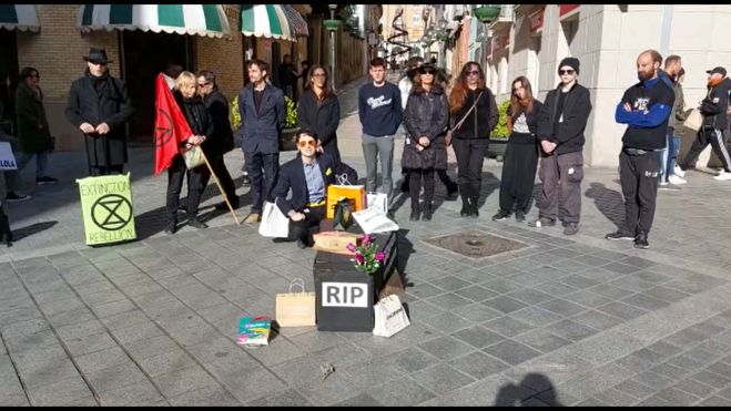 La "performance" ha sido sumamente llamativa. Un cortejo fúnebre en torno a un ataúd con las siglas RIP (requiescam in pacem). Luego, un buen número de bolsas del Black Friday en torno al féretro, como símbolo del abuso del plástico y de los hábitos perniciosos para el planeta. Un portavoz ha explicado a EL DIARIO DE HUESCA la importancia de protestar a través de todos los medios pacíficos para que los gobiernos garanticen la justicia social, climática y ecológica priorizando a los colectivos en situación de vulnerabilidad, sin incurrir en falsedades, trabajando cooperativamente, combatiendo la pérdida de biodiversidad y reduciendo las emisiones de gases de efectos invernadero a cero". Algunos de sus miembros ni siquiera creen que reciclar sea una solución trascendental, sino que defienden la reducción y la reutilización. De ahí que en la pared de la caja fúnebre apareciera la leyenda "El exceso de consumo mata nuestro planeta".