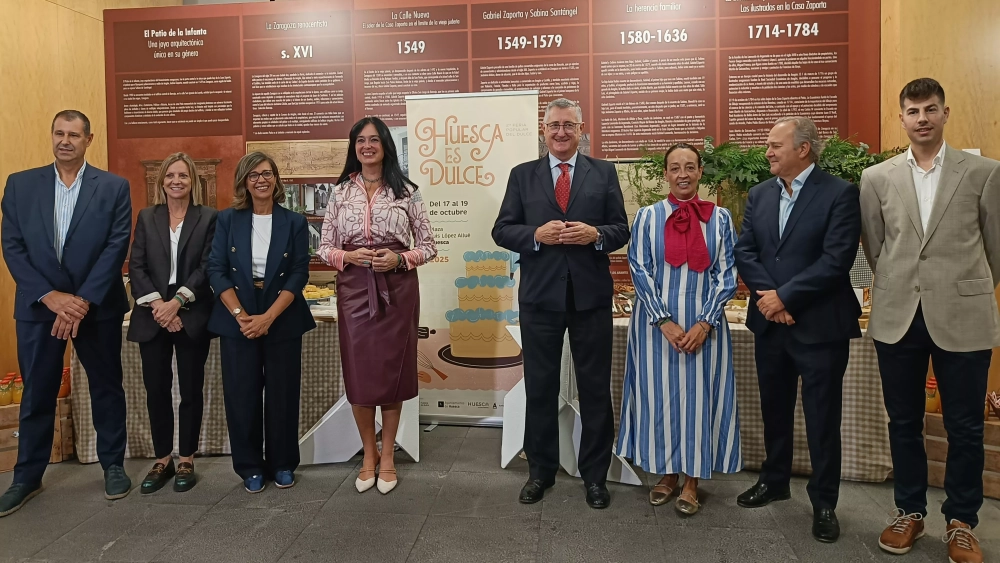 El Patio de la Infanta de Ibercaja en Zaragoza ha acogido la presentación de la segunda edición de la Feria Huesca es Dulce, que tendrá lugar los días 17, 18 y 19 de octubre en la plaza de López Allué, en un acto en el que han participado la alcaldesa, Lorena Orduna, los consejeros de Turismo y Servicios Sociales, Manuel Blasco y Carmen Susín, el diputado Sergio Serra y el presidente del Gremio de Pasteleros, Jairo Vincelle, nuevo en el cargo desde su condición de pastelero en su establecimiento en Jaca.