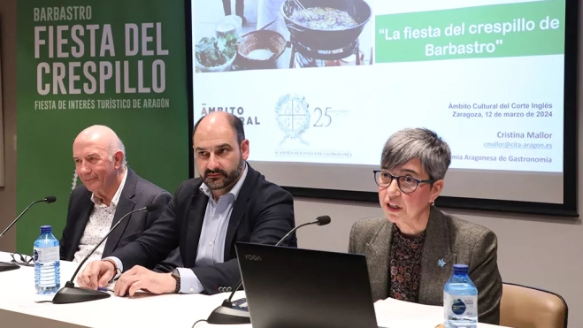 La Fiesta del Crespillo se presentó este martes día 12 en la Sala Ámbito Cultural de El Corte Inglés del Paseo de la Independencia de Zaragoza dentro de las conferencias dedicadas a diferentes fiestas gastronómicas aragonesas que organiza la Academia Aragonesa de Gastronomía. Ante cerca de un centenar de personas, Fernando Noguero, de la Asociación Tradiciones, Cristina Mallor, ingeniera agrónoma y miembro de la Academia, y el alcalde de Barbastro, Fernando Torres, disertaron sobre la borraja y acerca de este dulce típico del Alto Aragón.