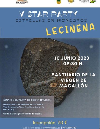 La Agrupación Astronómica de Huesca y AstroMonegros organizan la sexta edición de la Star Party "Estrellas en Monegros" en Leciñena el 10 de junio, con actividades divulgativas astronómicas, cuyo tema principal versará en torno a los meteoritos y una observación nocturna con telescopios.