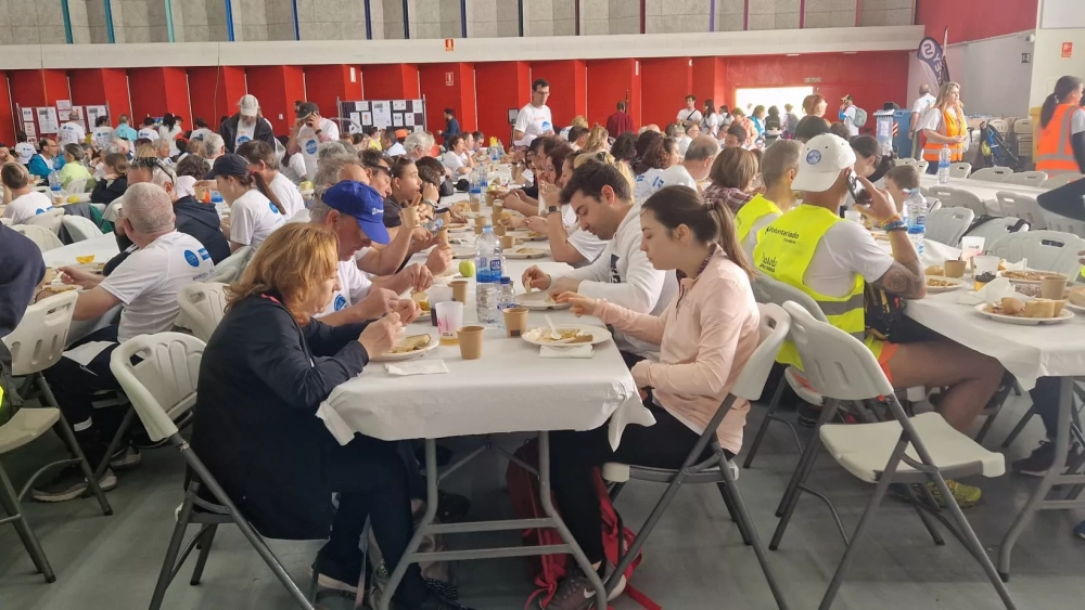 Nada más cruzar tras hacer los 18 kilómetros del recorrido han podido recoger su plato de garbanzos, fruta y pan, para pasar a ocupar las mesas instaladas en la parte posterior del Palacio de Congresos. Una organización de lujo para poder seguir la gran fiesta de Aspace. Un buen número de voluntarios muy bien organizados han colaborado en que todo saliera a pedir de boca en esta impresionante comida de la que disfrtutan los participantes, desde el reparto hasta la recogida de los residuos.