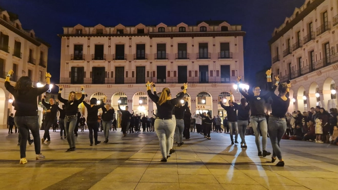 Alrededor de 80 joteros y joteras y han bailado este jueves en Huesca la jota de Alcañiz, al mismo tiempo que se repetía este flashmob en las otras dos capitales aragonesas, Zaragoza y Teruel, con motivo del Día Internacional del Cáncer Infantil, con el fin de dar visibilidad a esta enfermedad y pedir que se dedique más dinero a la investigación.