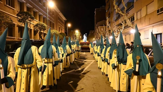 El importante frío y una lluvia previa que ha amenazado no han sido obstáculo para la Procesión de Jesús Atado a la Columna que ha partido de la cofradía homónima y desde el Colegio de San Viator, que ha comenzado con algo de retraso ante la incertidumbre y muchos plásticos que han tapado los estandartes de las distintas agrupaciones y también han protegido el paso que ha sido despojado de ellos en el momento del inicio del desfile.