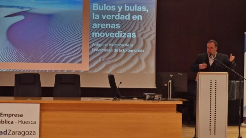 La conferencia comenzó con un relato creado por la Inteligencia Artificial sobre la irrupción de extraterrestres en un aula de los Antiguos Alumnos de la Universidad de la Experiencia de Huesca y concluyó en medio de las preguntas y las dudas precisamente sobre la irrupción de la IA y el control del ser humano, como precisamente ha puesto de manifiesto el pensador Yuval Noah Harari. Javier García Antón, director de EL DIARIO DE HUESCA, guió a los presentes en la Facultad de Empresa del Campus de Huesca por la historia de los bulos (con su definición de noticia falsa propalada con algún fin) desde el más antiguo que relata el Génesis, el engaño al que somete la serpiente a Eva e, inducido por ella, a Adán, finalmente desalojados del Jardín del Edén.