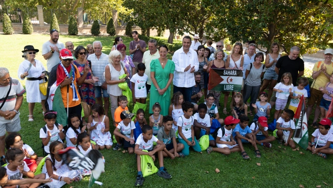 Carmen Susín ha recibido a decenas de esos pequeños, acompañados por sus familias de acogida, además de a Yahia Edjil, Merche Saavedra, presidenta de Um Draiga, Amigos del Pueblo Saharaui en Aragón, y Oriol Gavín, de Arapaz MPDL–Aragón, en una recepción en los jardines de Presidencia del Pignatelli.