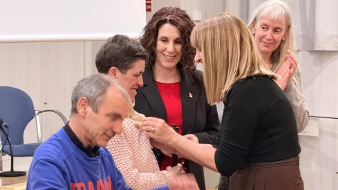 El acto, celebrado el jueves, congregó a representantes institucionales, protagonistas del programa, entidades sociales y numeroso público que llenó el salón de actos para acompañar el estreno de esta producción dedicada a la capital del Alto Gállego y a buena parte de quienes conforman su tejido social. Al frente del proyecto, los reporteros Nacho Oliván y Pilar Lanuza, conductores del espacio, recibieron una acogida especialmente cálida por parte de la ciudad. Además de los aplausos, la alcaldesa les hizo entrega de un pin con el escudo municipal, un detalle simbólico que ambos lucieron en la solapa como recuerdo de la jornada.