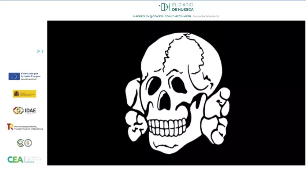 Pasadas las 18 horas de este martes, la imagen de una calavera burlona, con expresiones de payaso, invadió la portada de EL DIARIO DE HUESCA con un titular común en mayúsculas: "HACKED BY @GOV.ETH JOIN T.ME/EHMF88!". Eran varias las noticias que había asaltado el delincuente con esa leyenda sólo cambiada en la segunda en la que había añadido "Fuck you" (el popular "jódete" en inglés).