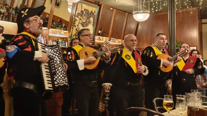 Varios miembros de la Honoris Tuna Aragón sorprendían la tarde de este sábado con una sucesión de canciones tan características de este género y también otras populares como el Sha Feito de Nuei en el Café del Arte de Huesca, donde irrumpieron después de una celebración muy peculiar.