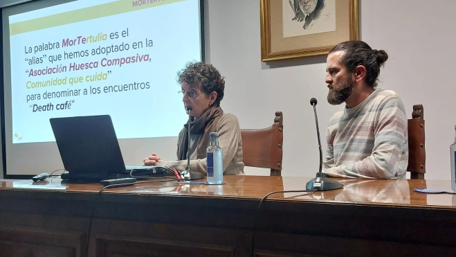 Los doctores Javier Moraleda y Natividad Mur han expuesto el camino de Huesca como Ciudad Compasiva que tiene ya referentes individuales como el acompañamiento en el proceso de morir y colectivas como la organización de las “mortertulias”, el nombre específico oscense para las internacionales “Dethcafés”.
