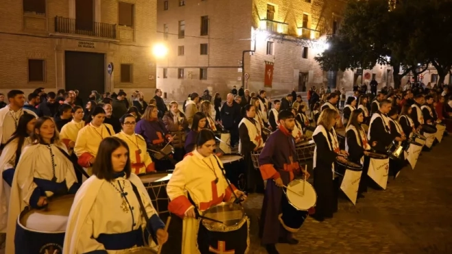 Con el pensamiento y las oraciones situados en la Policlínica Gemelli, donde sufre la enfermedad el Papa Francisco, Huesca ha estrenado la Cuaresma con el Miércoles de Ceniza oficiado en la Catedral desde las 20 horas por el administrador apostólico de la Diócesis, Vicente Jiménez Zamora, que ha asistido complacido al primer toque de tambor este año protagonizado por la Cofradía de Santiago. A este grupo y a representantes del resto, ha dirigido su agradecimiento, sus deseos de buenas noches y proclamado: "Camino de la Semana Santa". La que van a recorrer, como reza el lema del Jubileo, los Peregrinos de la Esperanza.