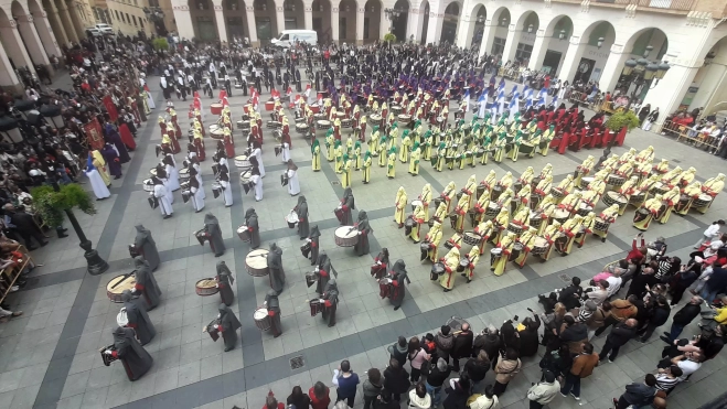 A las 11:30 horas, la Plaza López Allué se ha convertido en un auténtico epicentro sonoro, donde cada uno de los doce grupos reunidos ha desarrollado una exhibición individual cargada de fuerza, ritmo y devoción, que les ha permitido mostrar su estilo y personalidad.