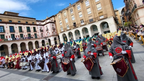 El recorrido ha discurrido por las calles Moya, Coso Alto, Coso Bajo hasta la plaza Santo Domingo, donde las bandas han aguardado la llegada de los romanos, encargados de custodiar al Cristo yacente en los prolegómenos de la procesión del Santo Entierro, el acto central de la jornada.