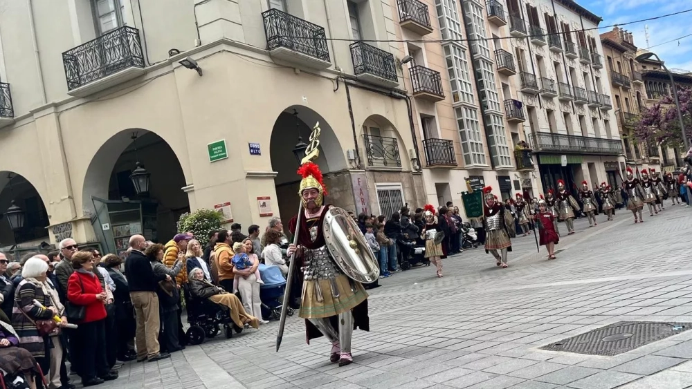 Con armaduras que reflejaban el sol de la espléndida mañana de Viernes Santo, los soldados han salido a las 14.00 de la Catedral y han variado su recorrido por las obras en el Coso Alto, pasando por las calles Las Cortes y San Salvador, plaza Arista, las calles Azara, Sancho Abarca, calle Moya, Coso Alto y Coso Bajo, donde han sido animados por parte del público.