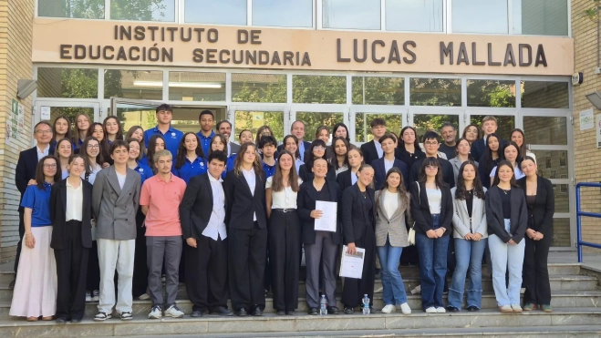 El acto de inauguración contó con la presencia de la alcaldesa de Huesca, Lorena Orduna, y de la directora del IES Lucas Mallada, Inés Fernández, acompañadas por el concejal de Educación, Infancia y Juventud, Guillermo Gómez Mur, y representantes del Centro de Profesorado, como Ana Abarca de Bolea.