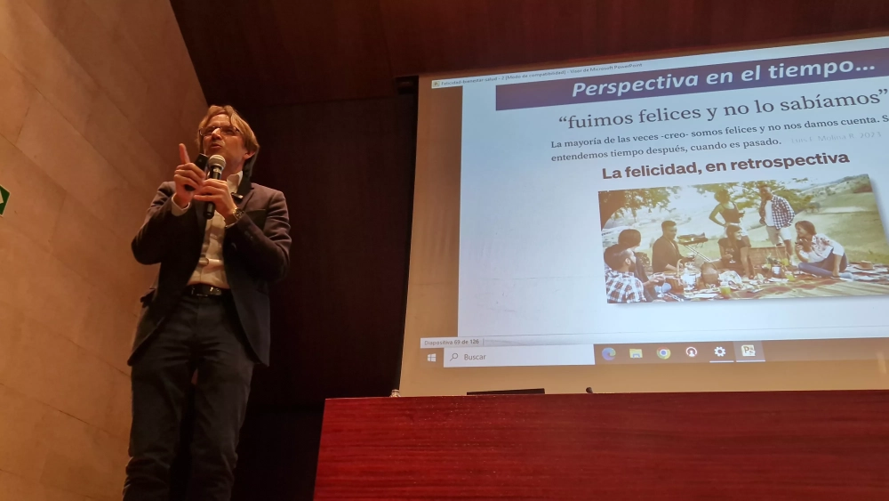 Olivera aseguró que con nuestras acciones podemos influir en nuestra felicidad en un alto porcentaje. Los asistentes reflexionaron sobre el momento más feliz de sus vidas. Foto Myriam Martínez
