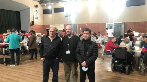 El presidente de la Liga de Fútbol Profesional, Javier Tebas Medrano, y el alcalde de Huesca, Luis Felipe, han compartido mesa y mantel con los usuarios, trabajadores y voluntarios de la Cruz Blanca. Se empieza a compartir en una tradición el acompañamiento de las dos personalidades a las personas que integran la Casa San Lorenzo.