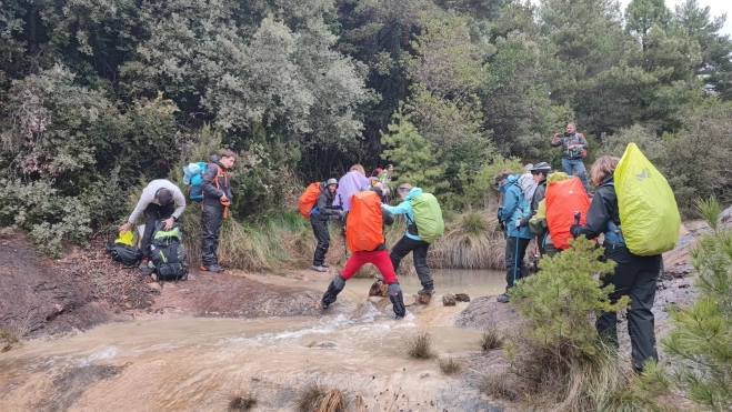 La salida se retrasó unos minutos debido a la lluvia, pero finalmente, con la ayuda de frontales y linternas, comenzaron la larga etapa de 45 kilómetros con la previsión de agua y nieve. A pesar de la lluvia inicial, el grupo caminó con frontales y linternas. A medida que avanzaban, se unió un coche de la Guardia Civil para darles protección.