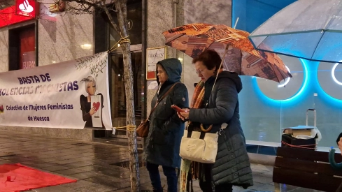 Bajo una lluvia incesante pero con el ánimo de siempre, se ha celebrado en la plaza Concepción Arenal, la concentración que tiene lugar cada último miércoles de mes contra las violencias machistas, organizado por el Colectivo feminista de Huesca.